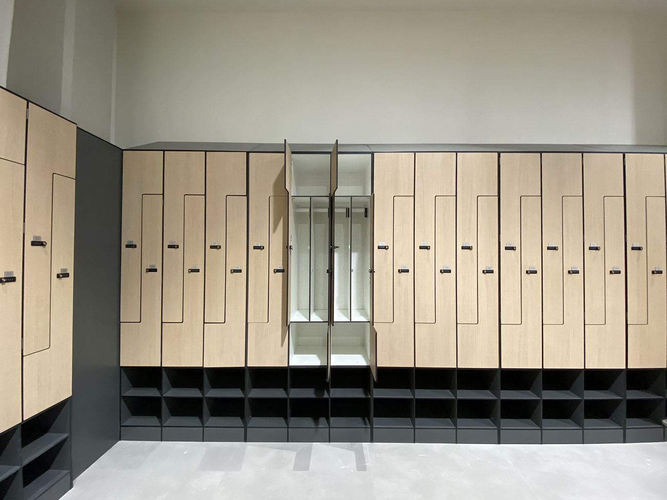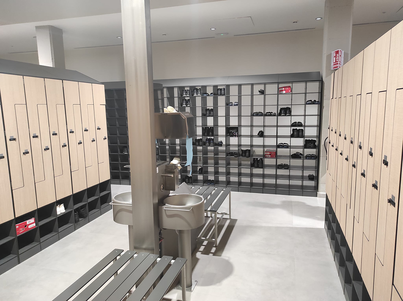 – Manufacture of 400 locker columns in phenolic material and customized with 2 L-shaped doors and 2 open shoe racks at the bottom, phenolic lockers with sloping overhead to avoid depositing objects on top and facilitate cleaning.