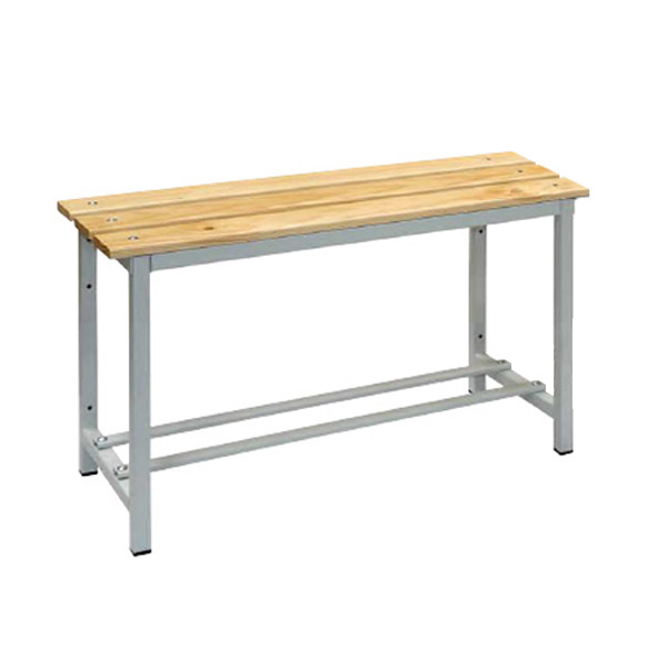 Banco con estructura metálica y lamas de madera. Solución robusta y cálida para vestuarios y zonas de descanso en espacios colectivos.