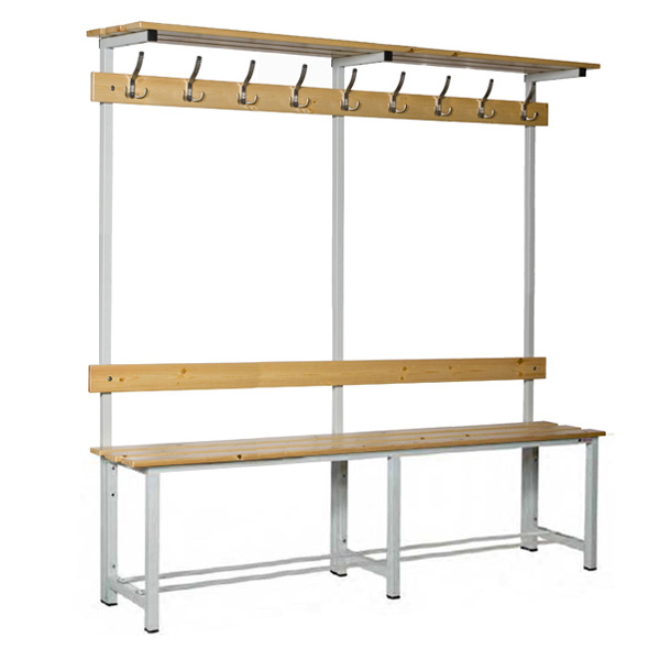 Banco con estructura metálica y lamas de madera. Solución robusta y cálida para vestuarios y zonas de descanso en espacios colectivos.