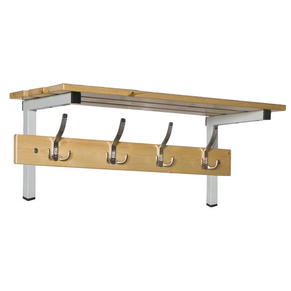 Repisa mural en madera para almacenaje auxiliar en vestuarios, aulas o zonas comunes. Diseño funcional y cálido.