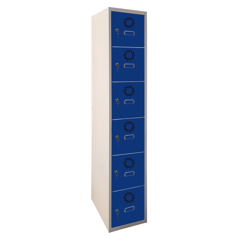 Taquilla metálica de 1 cuerpo, 6 puertas y 300 mm de anchura por columna. Fabricada en acero reciclable, combina resistencia, funcionalidad y sostenibilidad para un uso intensivo.