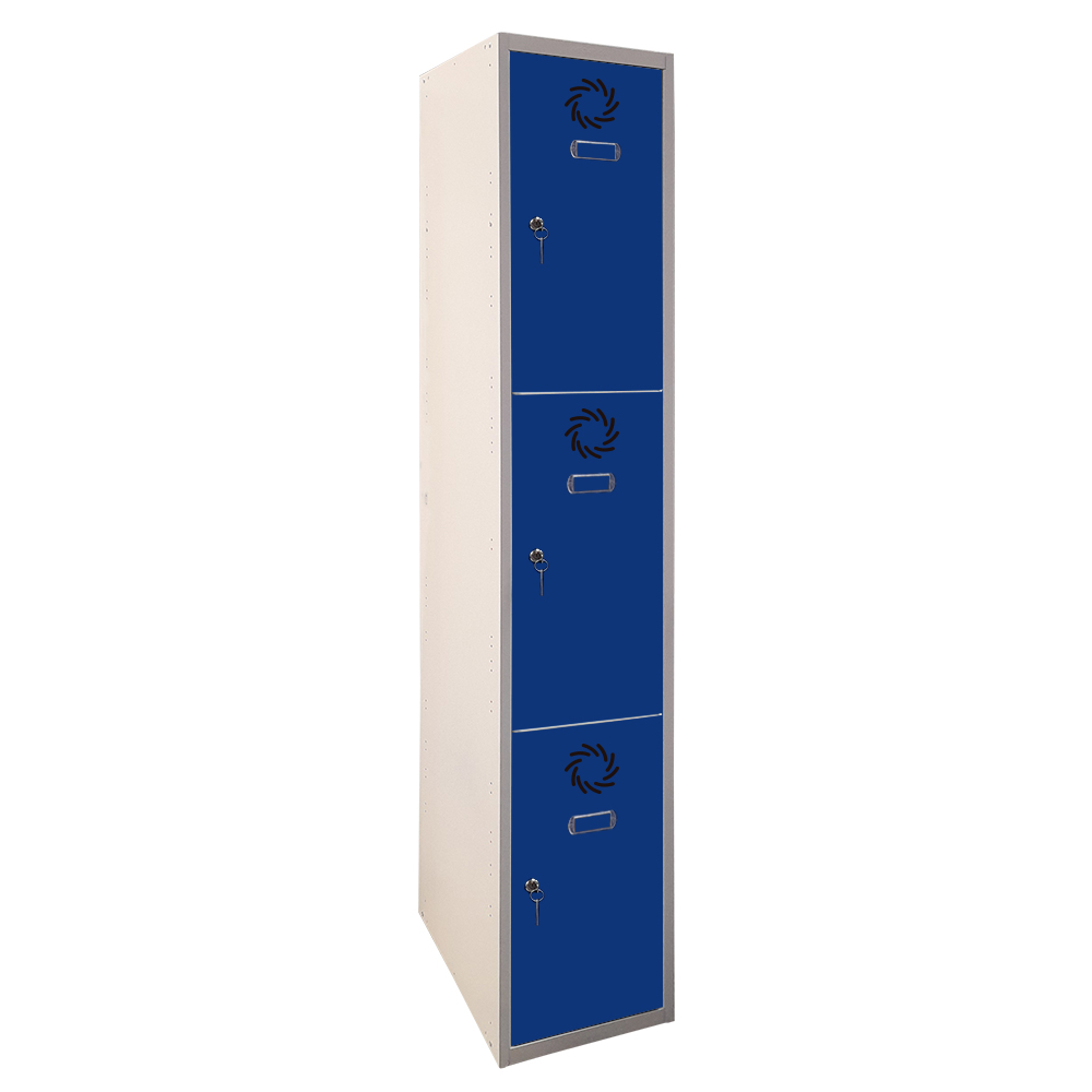 Taquilla metálica de 1 cuerpo, 3 puertas y 300 mm de anchura por columna. Fabricada en acero reciclable, combina resistencia, funcionalidad y sostenibilidad para un uso intensivo.
