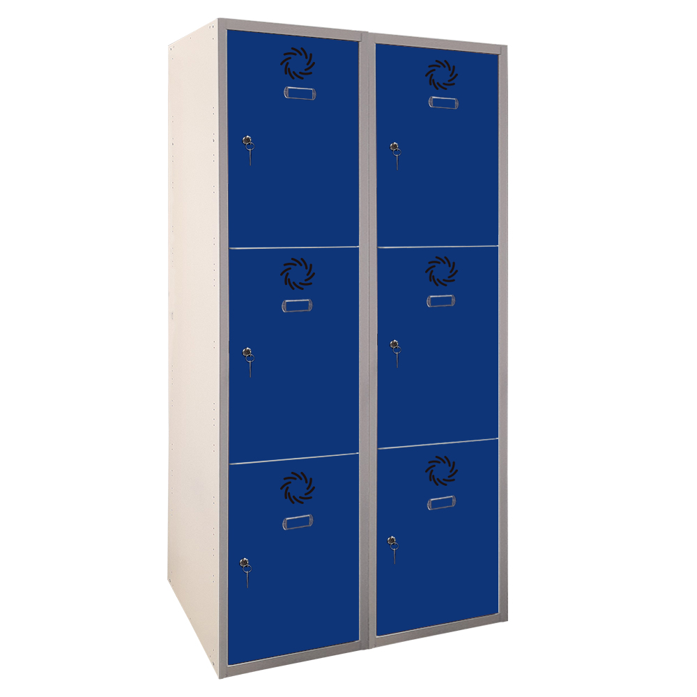 Taquilla metálica de 2 cuerpos, 3 puertas y 400 mm de anchura por columna. Fabricada en acero reciclable, combina resistencia, funcionalidad y sostenibilidad para un uso intensivo.