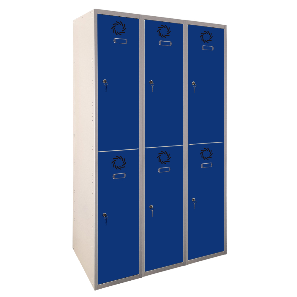 Taquilla metálica de 3 cuerpos, 2 puertas y 300 mm de anchura por columna. Fabricada en acero reciclable, combina resistencia, funcionalidad y sostenibilidad para un uso intensivo.