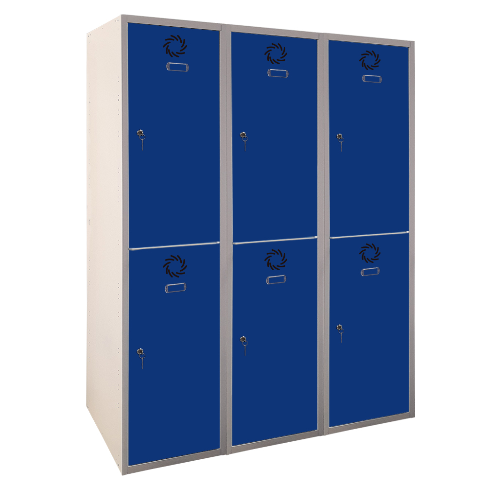 Taquilla metálica de 3 cuerpos, 2 puertas y 400 mm de anchura por columna. Fabricada en acero reciclable, combina resistencia, funcionalidad y sostenibilidad para un uso intensivo.